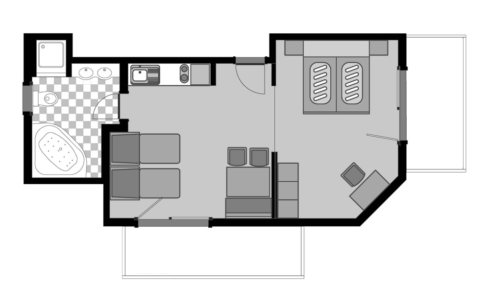 Large room equipped with a twin whirlpool, twin washbasin, WC, hairdryer, cosmetics mirror, radio, TV, DVD, HiFi and two balconies one of them to the south with fantastic view of the mountains and glaciers.