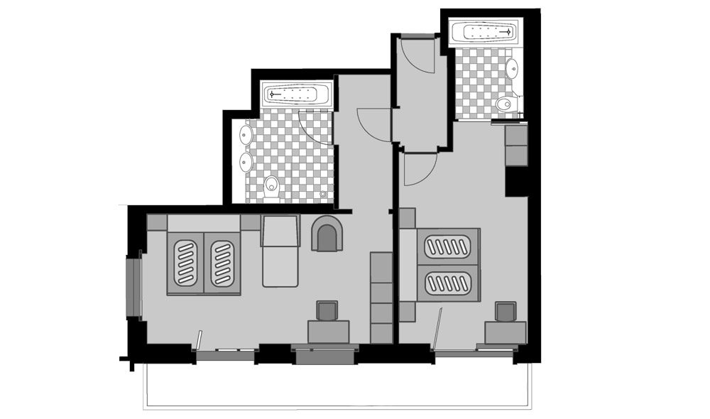 • Wheelchair-accessible double room (1 extra bed possible). Equipped with whirlpool, shower, hairdryer, WC, radio, TV and balcony to the south.