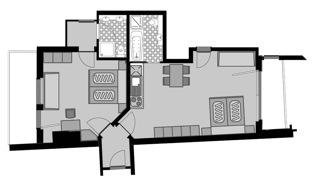- Bathroom with whirlpool, WC, shower, hairdryer, radio, TV and balcony to the south.