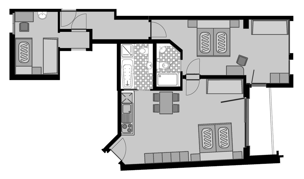 - Bathroom with whirlpool, WC, shower, hairdryer, radio, TV and balcony to the south with marvellous view of the mountains and glaciers.