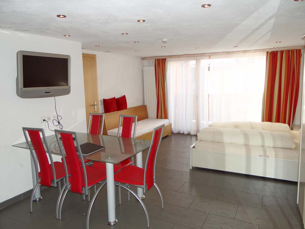 - Spacious, cosy double room (1 extra bed possible) equipped with kitchenette, table for 4-5 persons, bathroom with whirlpool, WC, shower, hairdryer, radio, TV and balcony to the south with marvellous view of the mountains and glaciers.