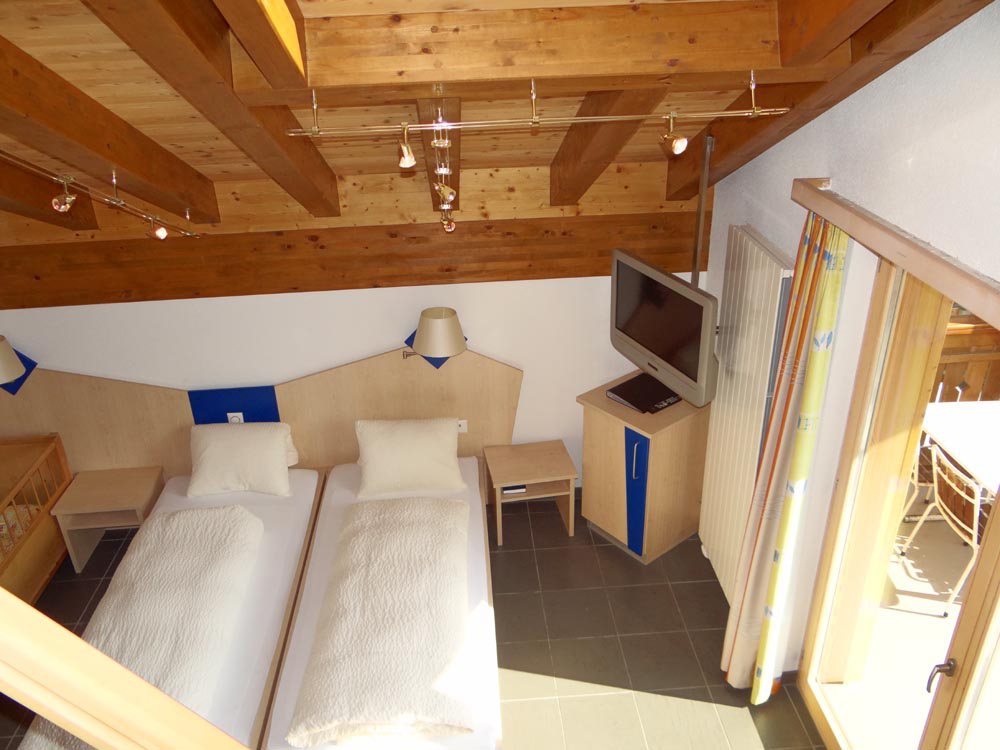 • Opposite a spacious double room (2 extra beds possible) equipped with shower, whirlpool, WC, hairdryer, radio, TV and balcony to the south with a marvellous view of the mountains and glaciers.