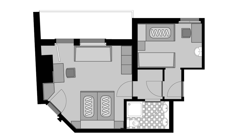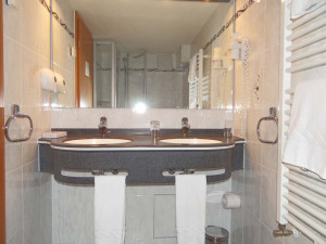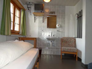 Chambre double (1 lit complémentaire possible) équipée de douche, sèche-cheveux, W.-C., radio, télé et balcon côté nord.