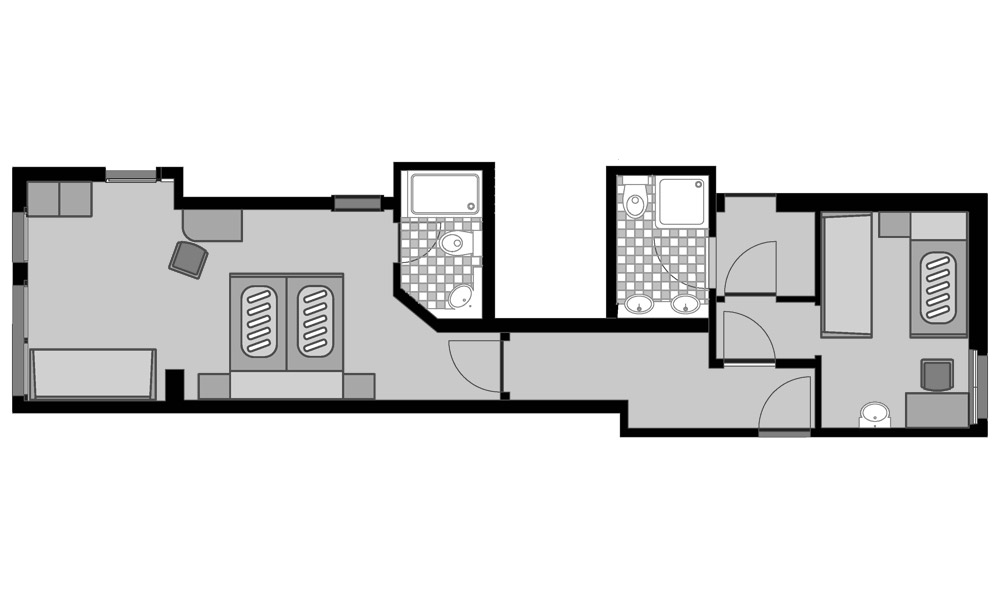 • Une porte communicante sépare la pièce voisine mansardée avec lavabo dans la chambre, pour 1-2 personnes. Salle de bain avec douche/toilette et sèche-cheuveux.