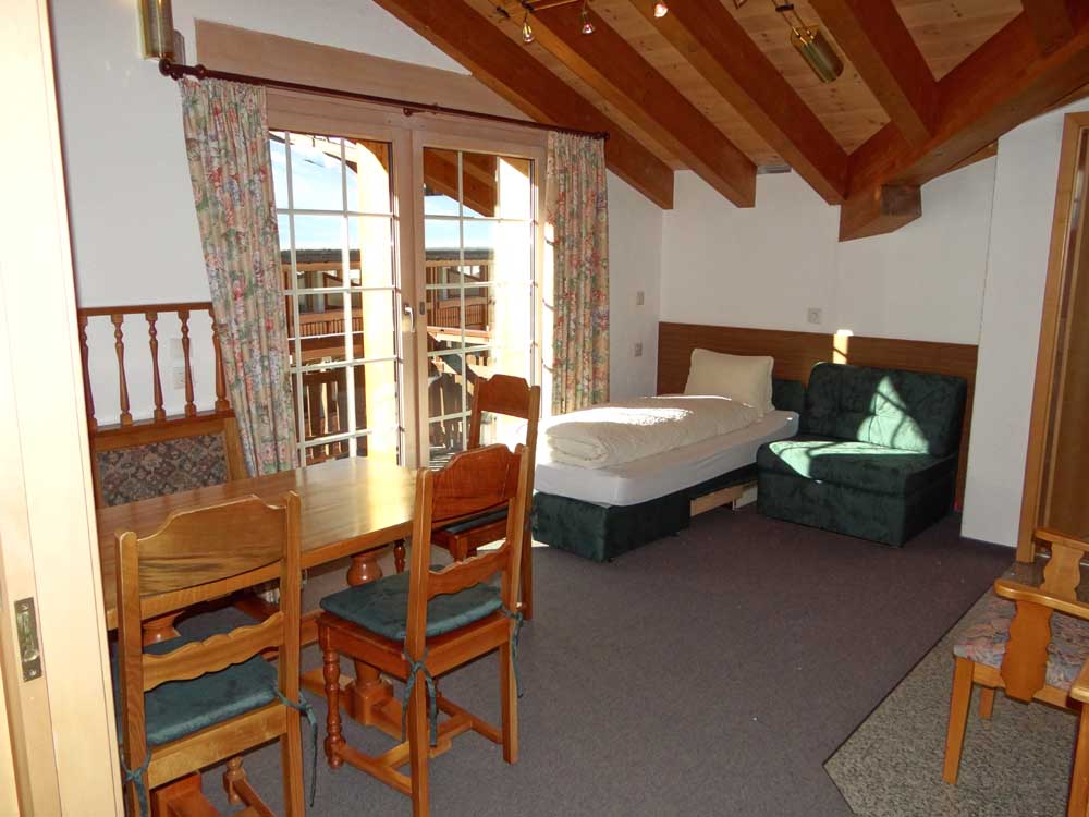 Geräumige und heimelige Juniorsuite im Dachgeschoss (1-2 Zusatzbetten möglich), mit Kochnische und Esstisch für 4 Personen. Badezimmer mit grosser Sprudelwanne, Doppelwaschbecken, Dusche/WC und Haartrockner. Flat TV mit Radio. Balkon zur Südseite mit freier Sicht auf die imposante Berg- und Gletscherwelt von Saas-Fee.