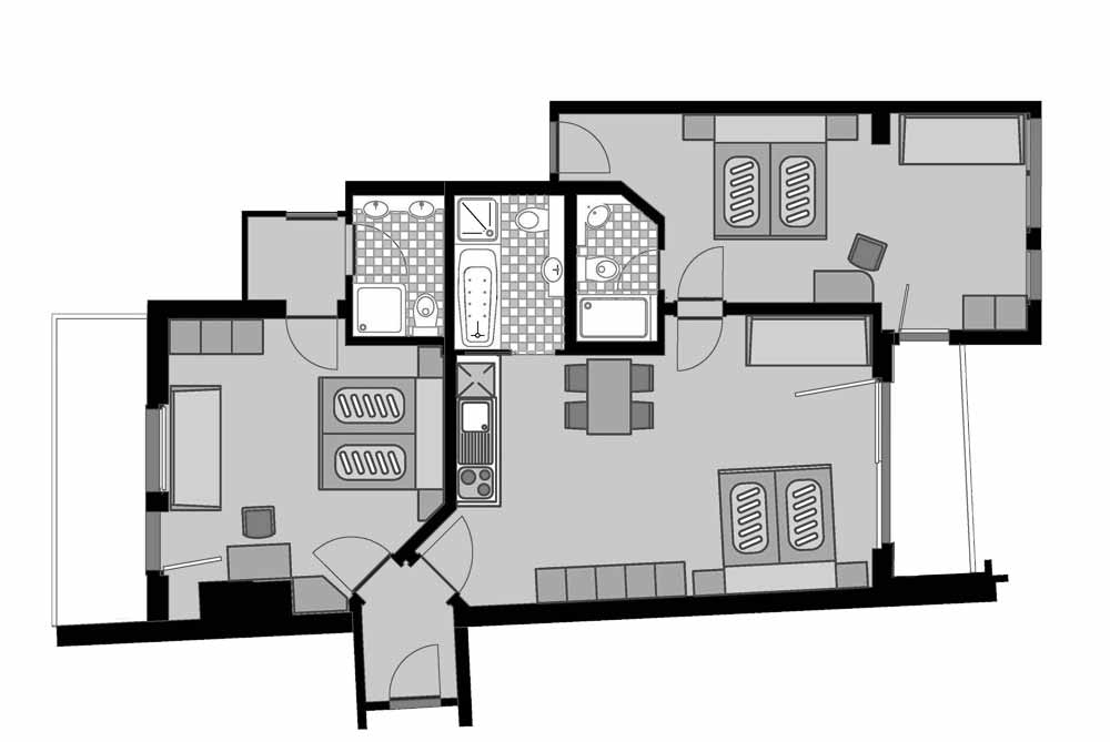 Geräumiges und modernes Doppelzimmer (ein Zusatzbett möglich) mit Kochnische, Esstisch für 4-5 Personen. Badezimmer mit Sprudelwanne, Dusche/WC und Haartrockner. Flat TV mit Radio. Balkon zur Südseite mit freier Sicht auf die imposante Berg- und Gletscherwelt von Saas-Fee.