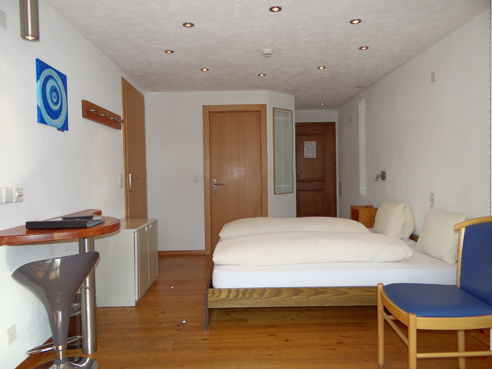 Praktisches Familienzimmer, Badezimmer mit Dusche/WC und Haartrockner. Flat TV mit Radio. Balkon zur Nordseite. Eine Verbindungstüre führt ins Nebenzimmer in der Dachschräge mit Waschbecken, welches 1 bis 2 Personen Platz bietet.