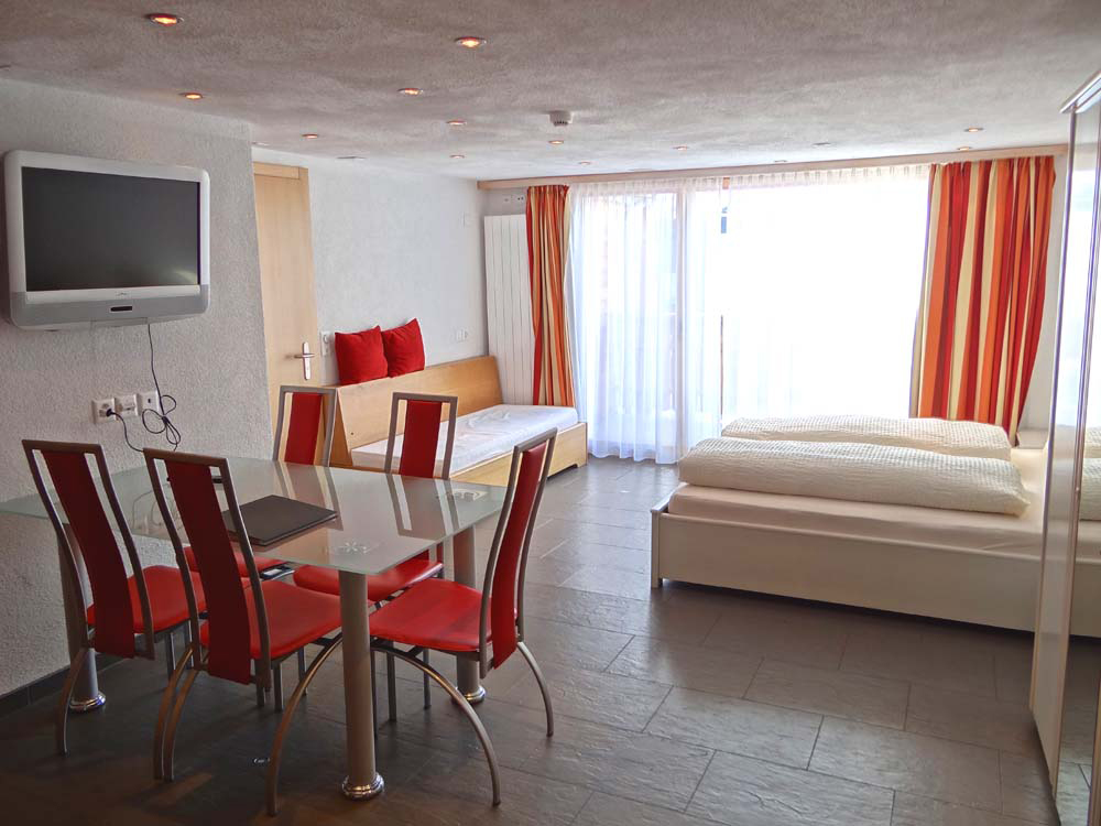 Geräumiges und modernes Doppelzimmer (ein Zusatzbett möglich) mit Kochnische, Esstisch für 4-5 Personen. Badezimmer mit Sprudelwanne, Dusche/WC und Haartrockner. Flat TV mit Radio. Balkon zur Südseite mit freier Sicht auf die imposante Berg- und Gletscherwelt von Saas-Fee.